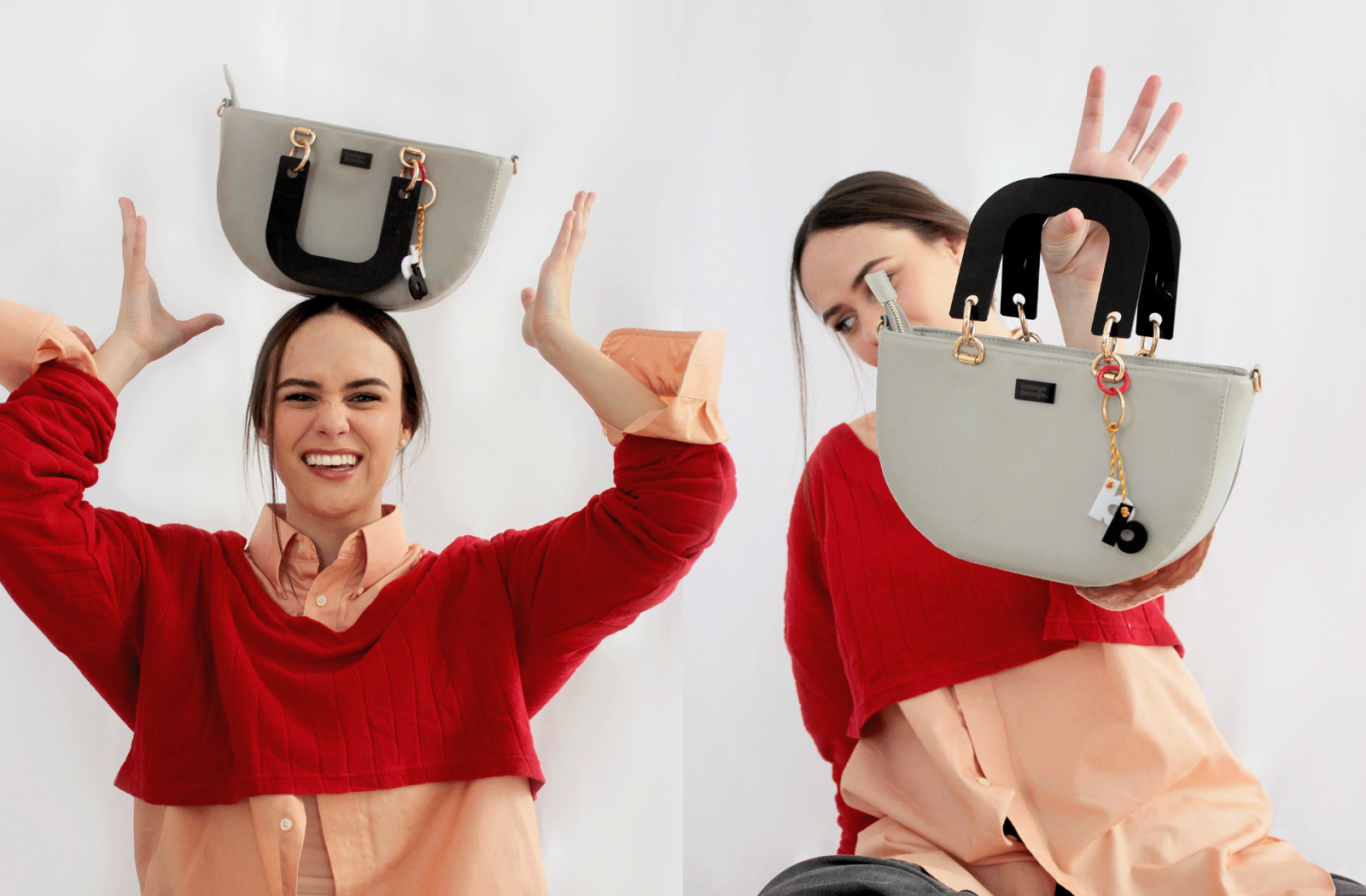 Rosa palo charol, brillante y suave, servido con correa principal estilo carey y un maridaje de detalles blanco & negro en patrones únicos.