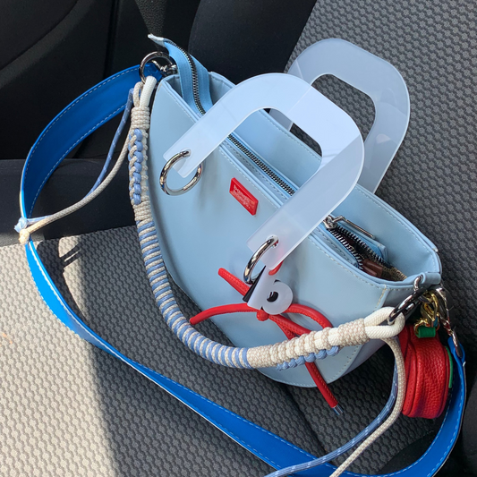 Rosa palo charol, brillante y suave, servido con correa principal estilo carey y un maridaje de detalles blanco & negro en patrones únicos.