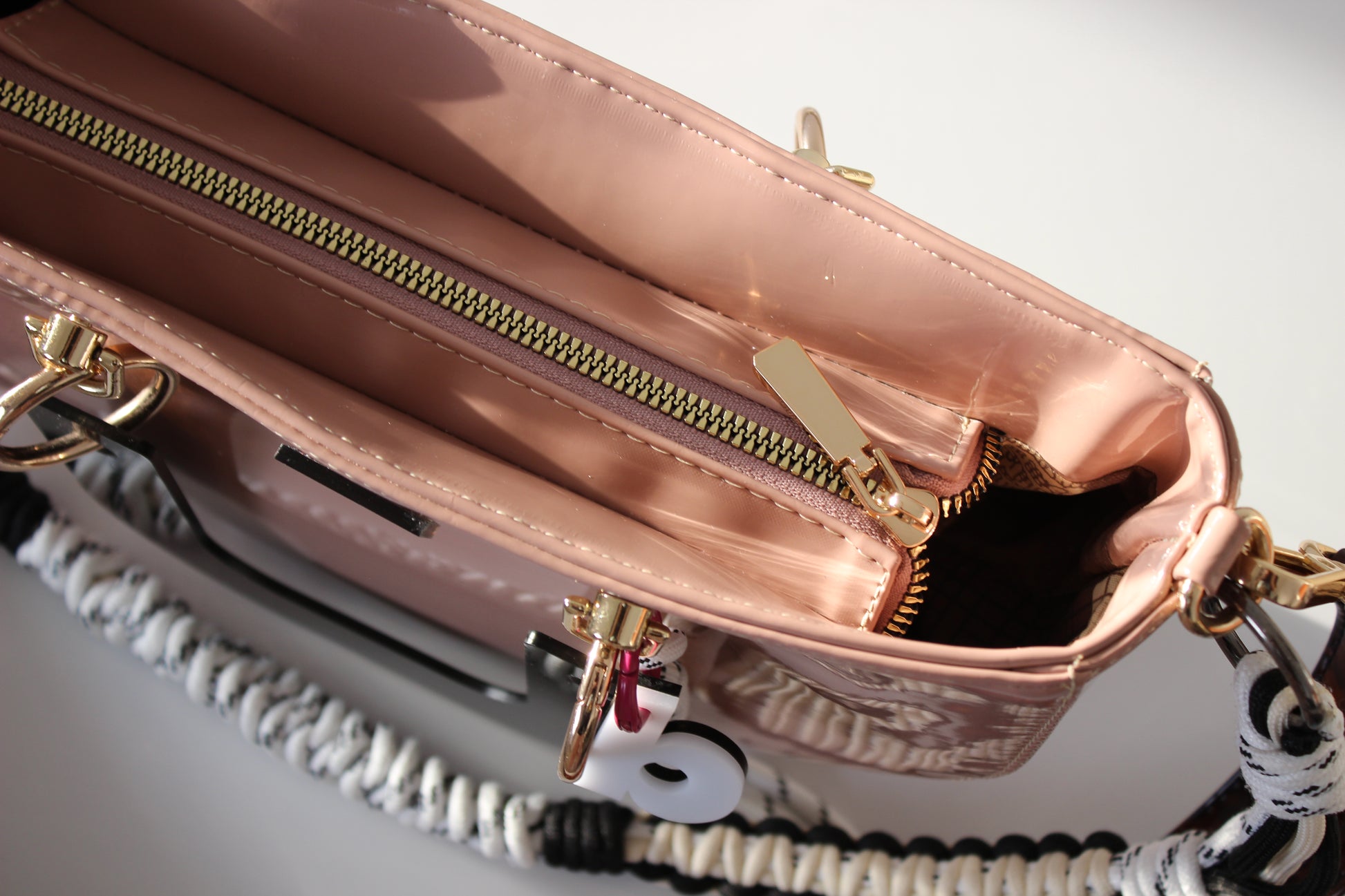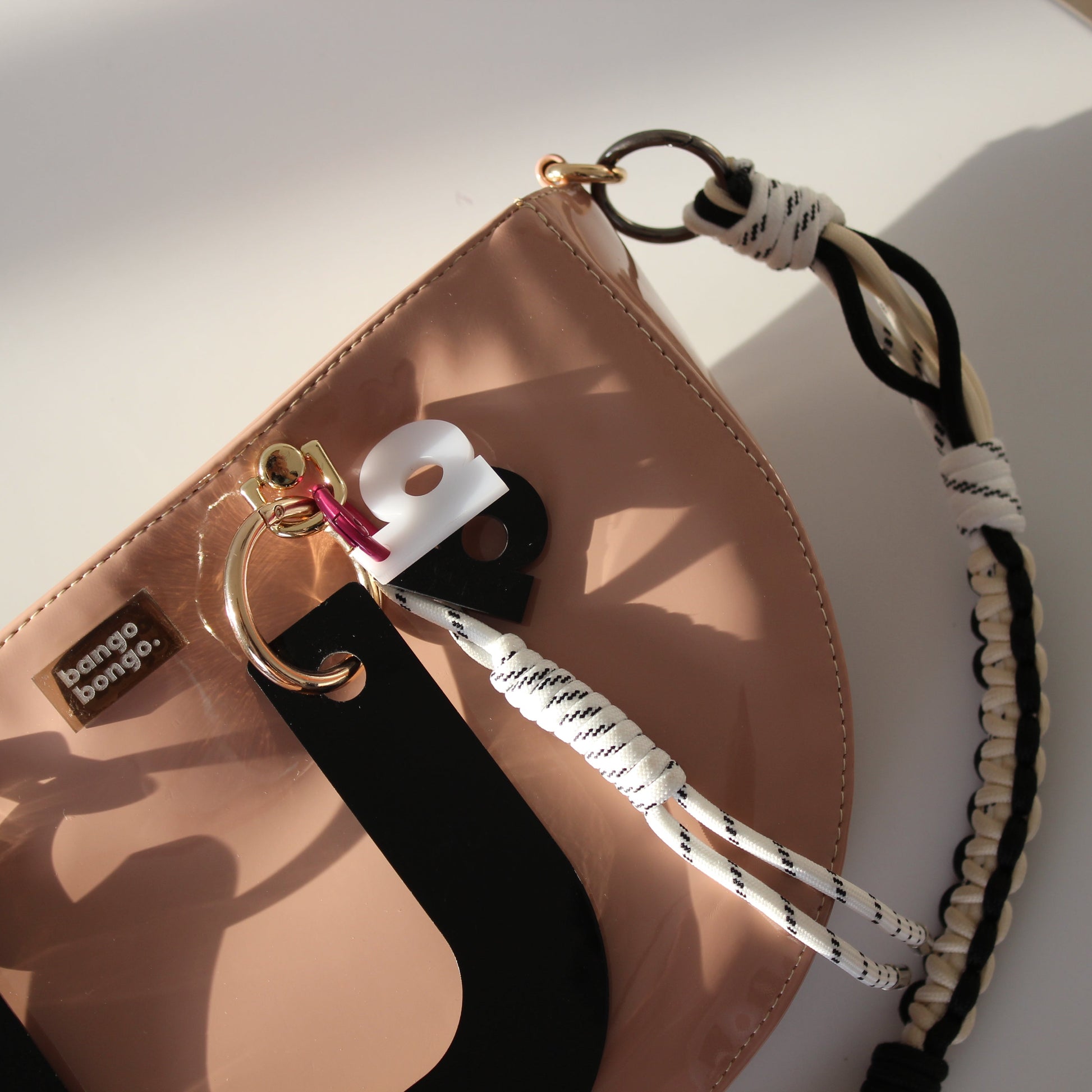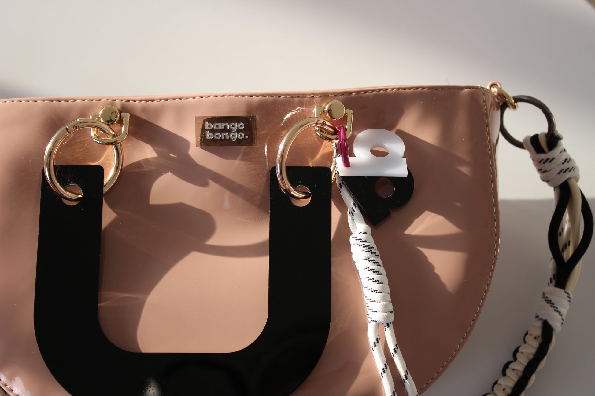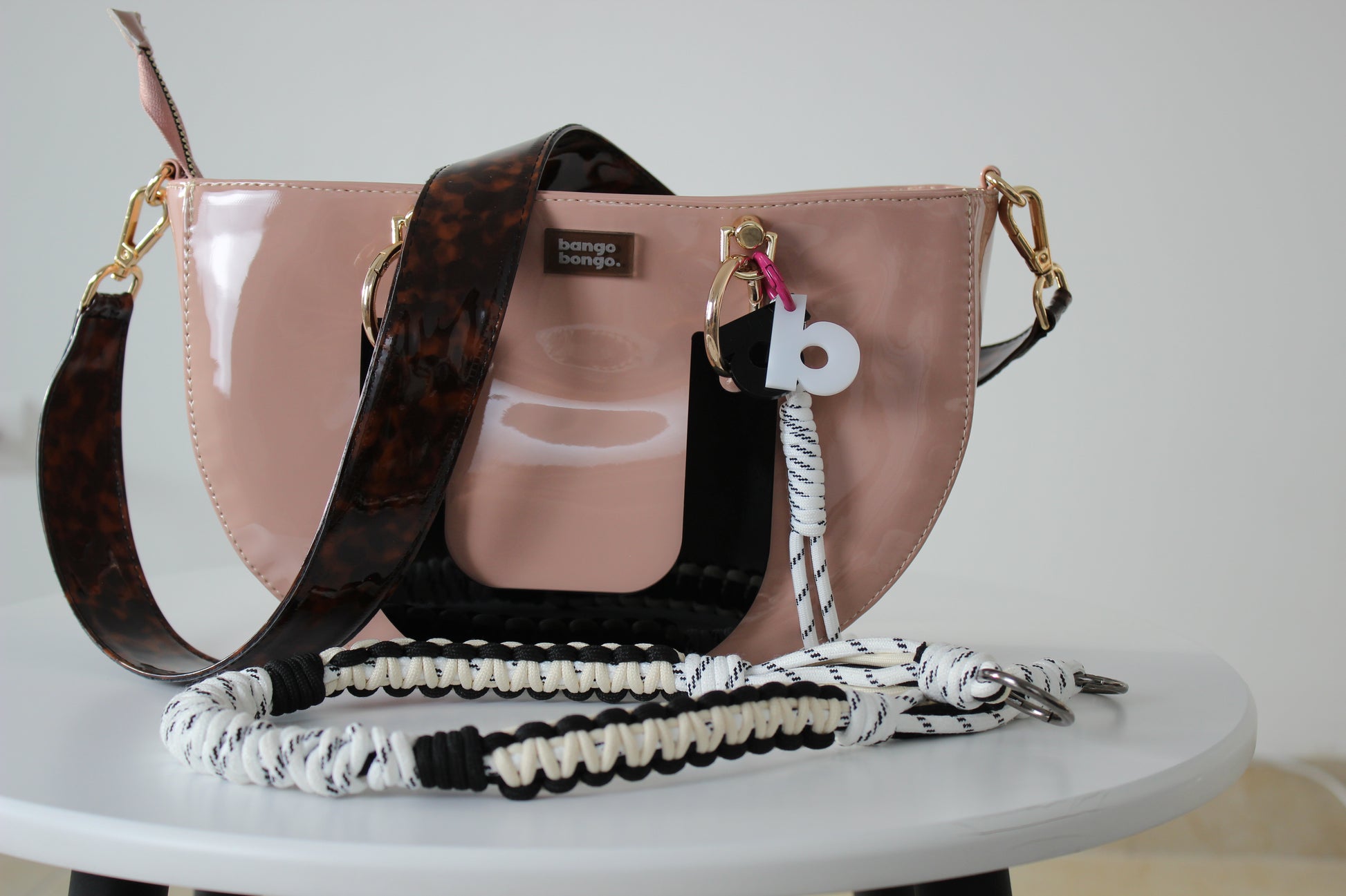 Rosa palo charol, brillante y suave, servido con correa principal estilo carey y un maridaje de detalles blanco & negro en patrones únicos.