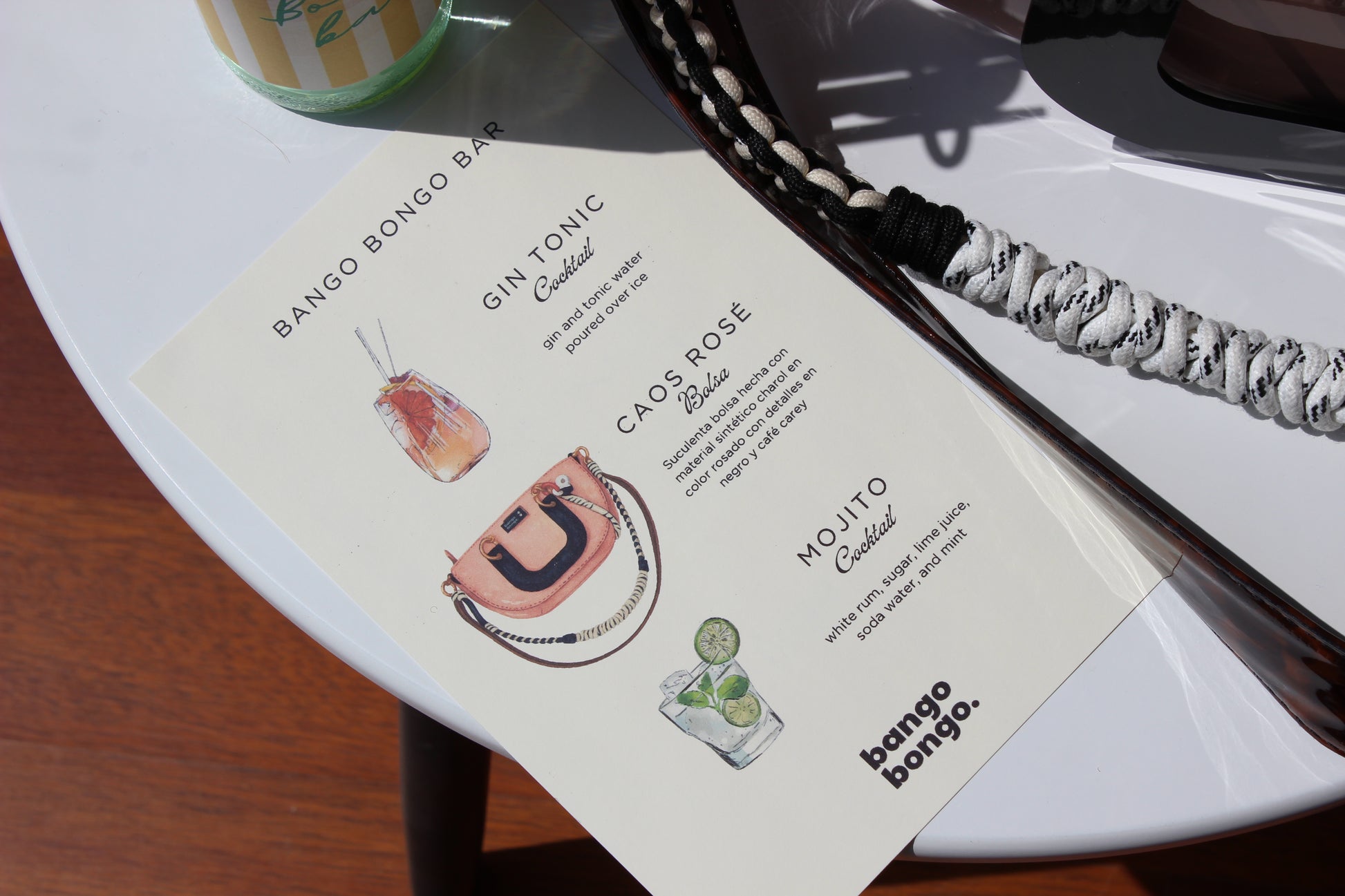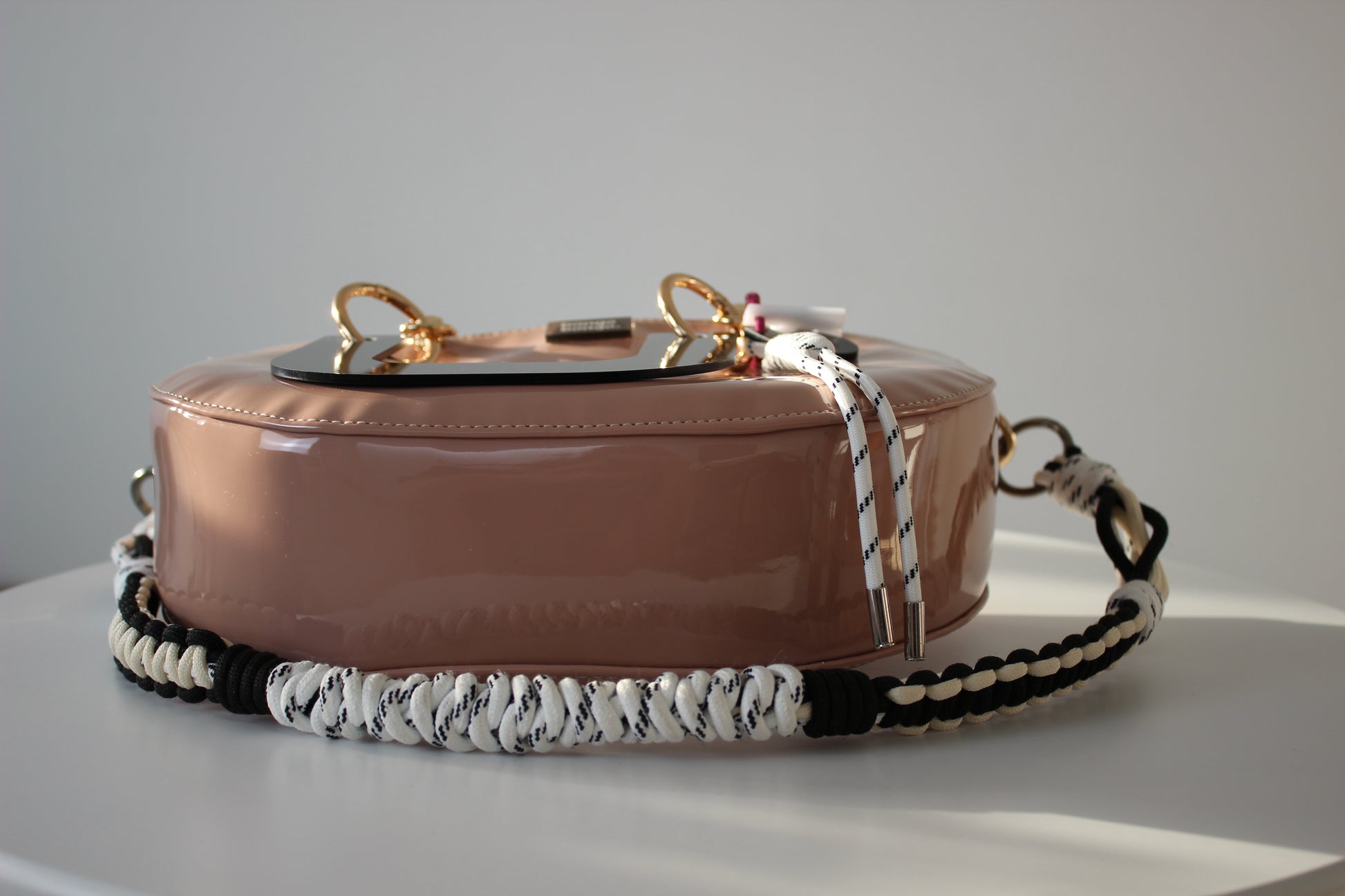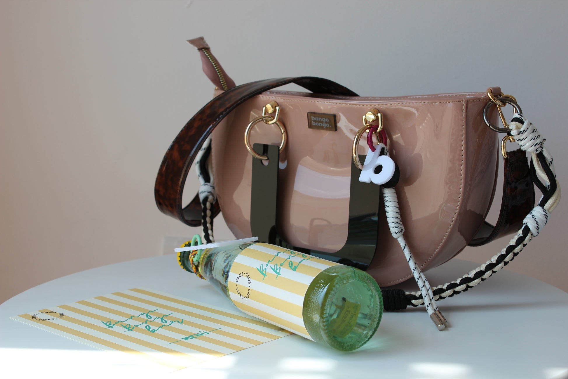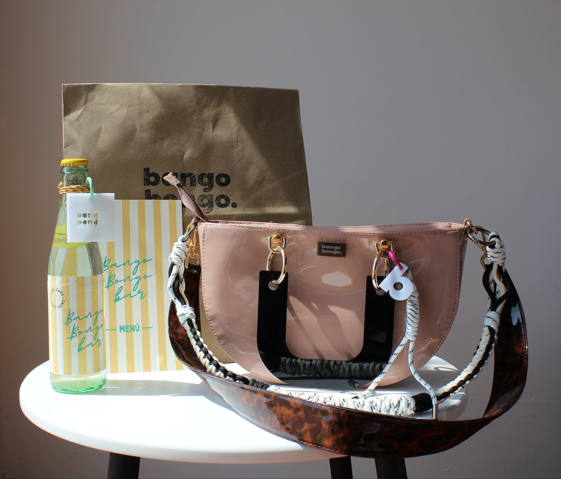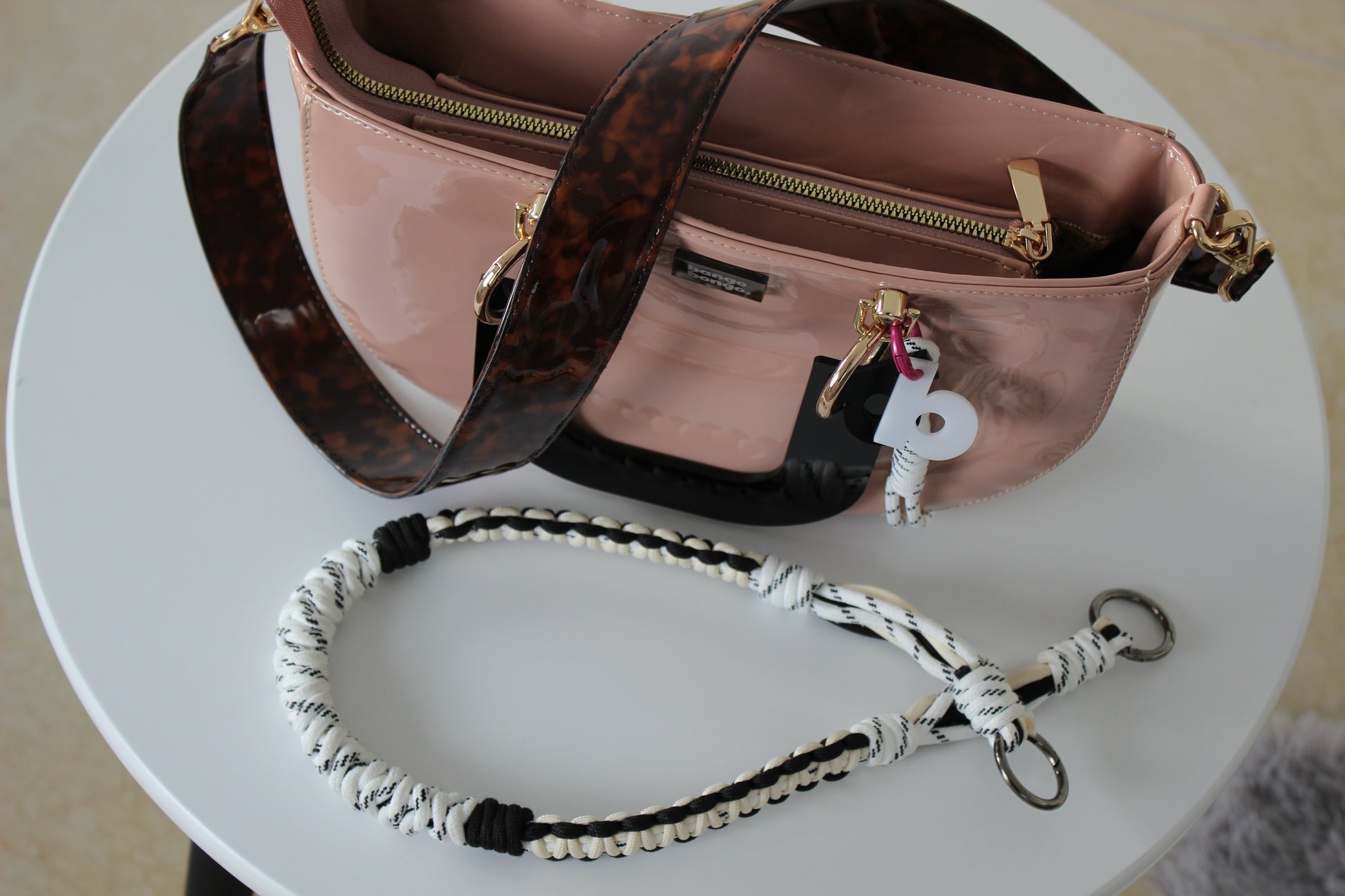 Rosa palo charol, brillante y suave, servido con correa principal estilo carey y un maridaje de detalles blanco & negro en patrones únicos.