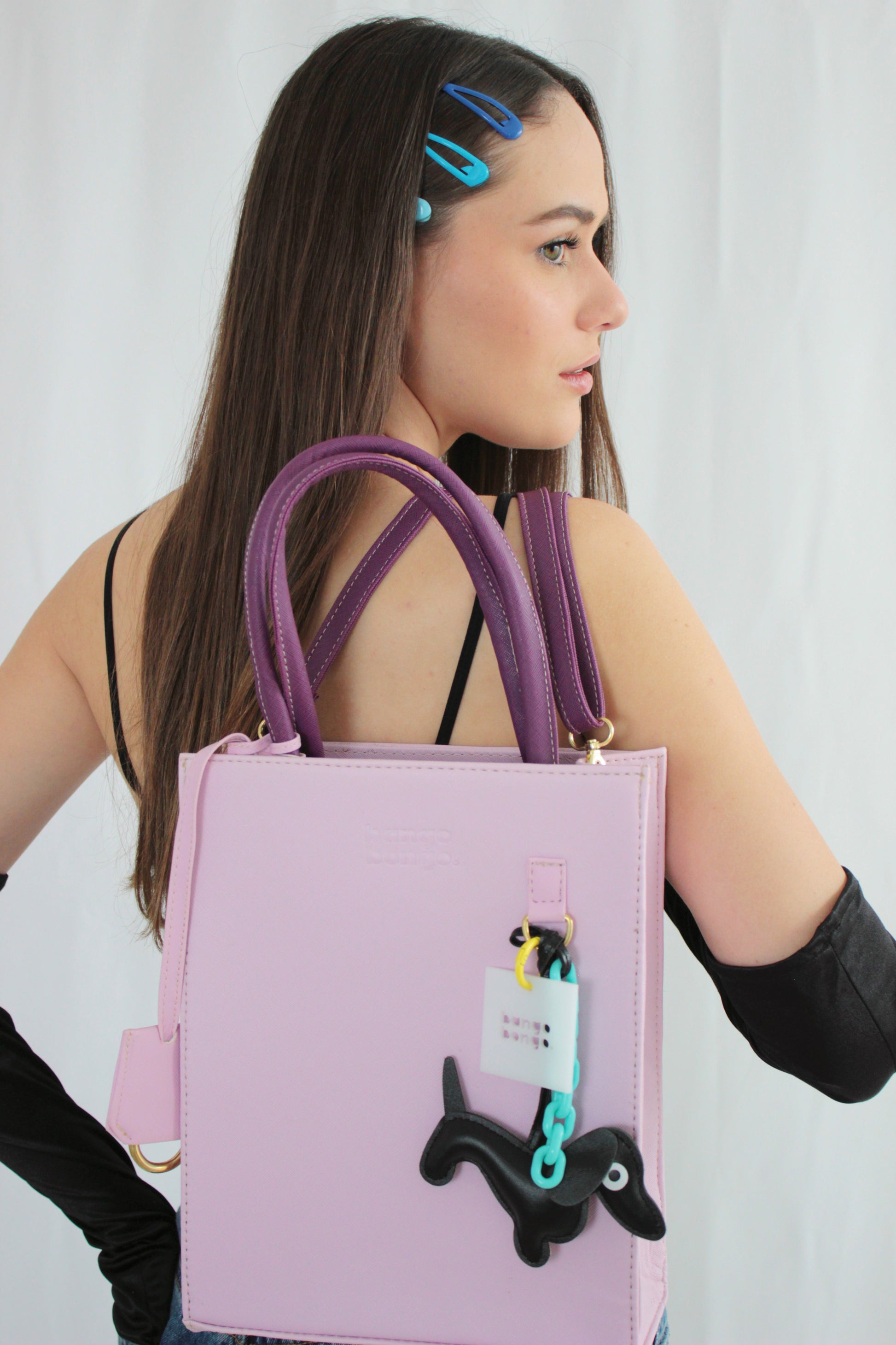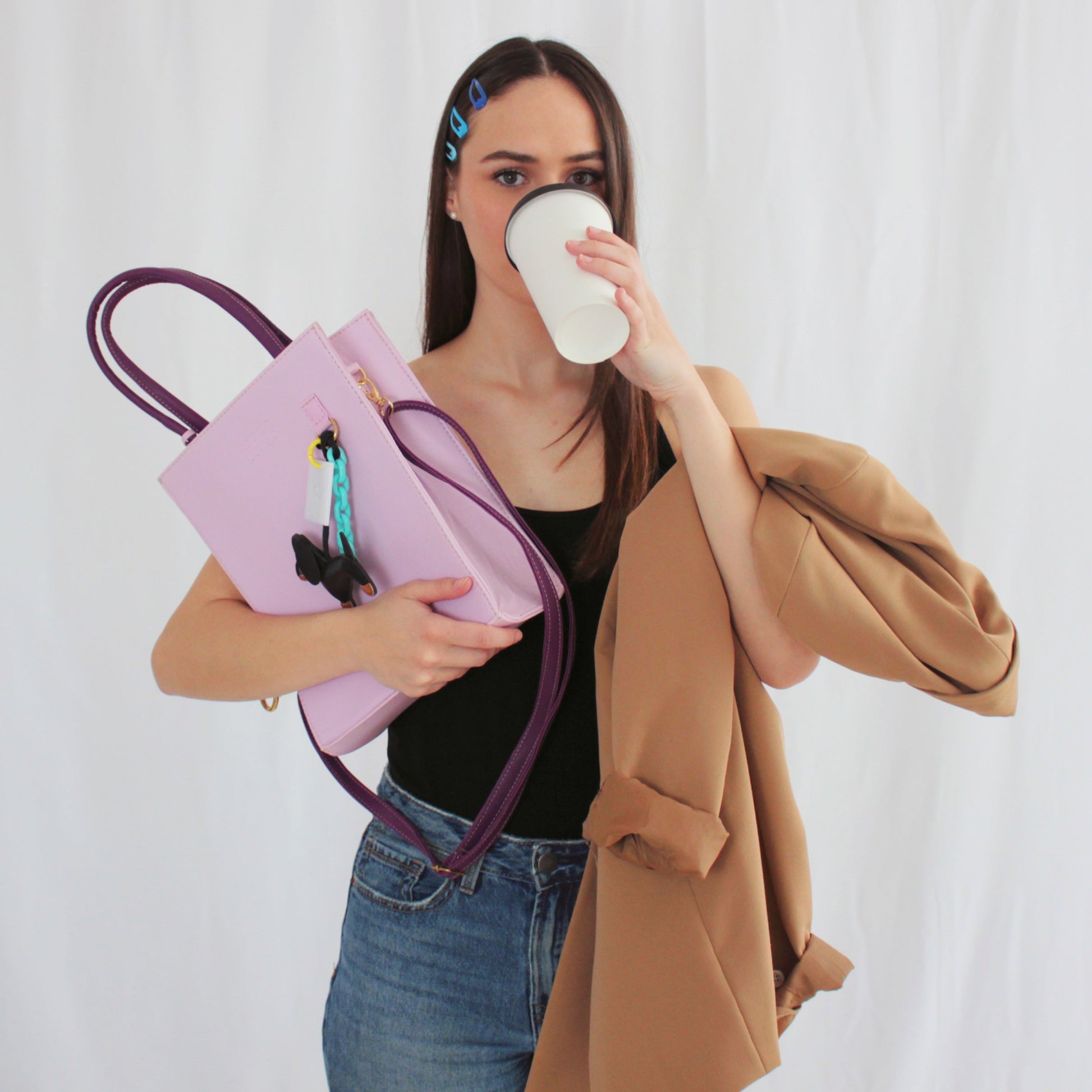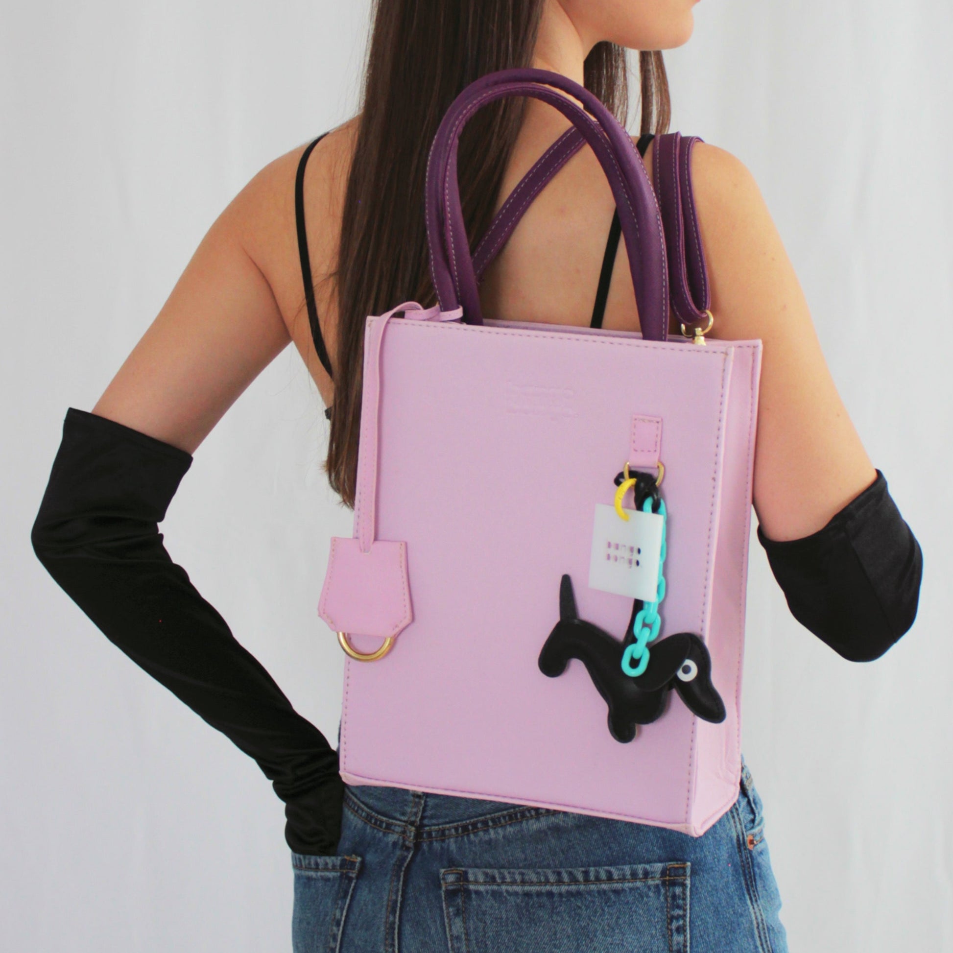 Cuerpo en color lila con asas y correa color morado uva